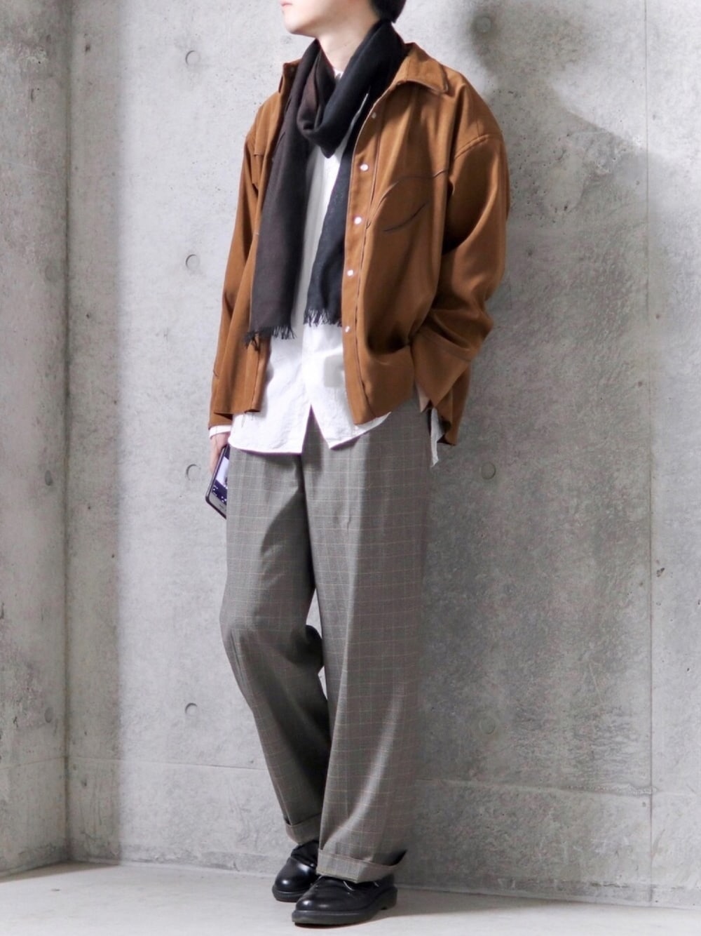 ちょっと前のコーデ、 ストールがあるバージョン。 ブラウンからベージュの グラデーションを作るイメージで。 このところ一日の中の気温差が激しいので、 ストールが便利です🧣