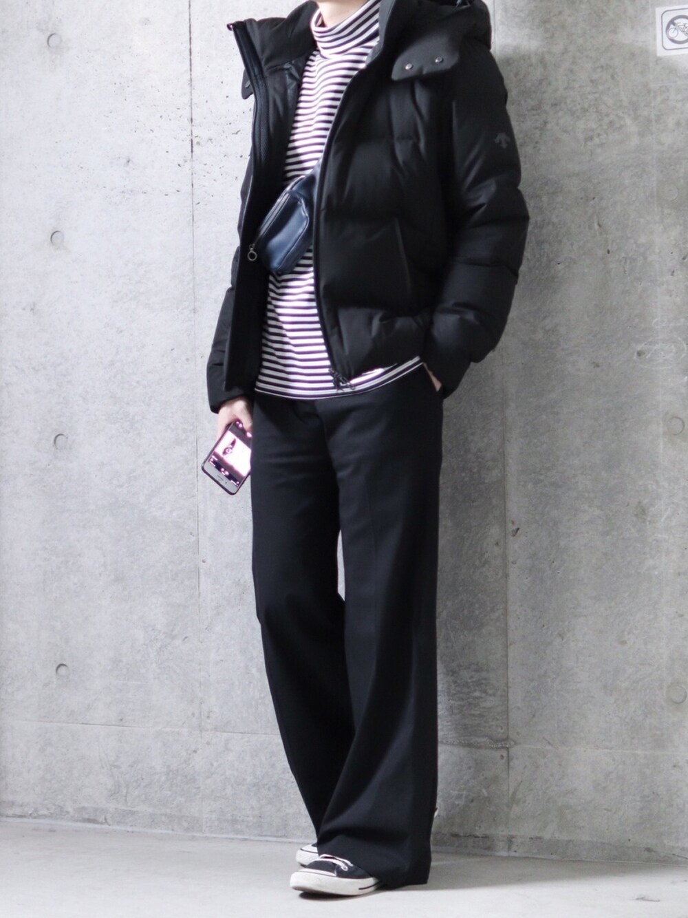 新しいアイテムが2つ。 デサントのダウンジャケット、アンカー。 古着で購入した太めのフレアパンツ。 モノトーンで合わせてみました。