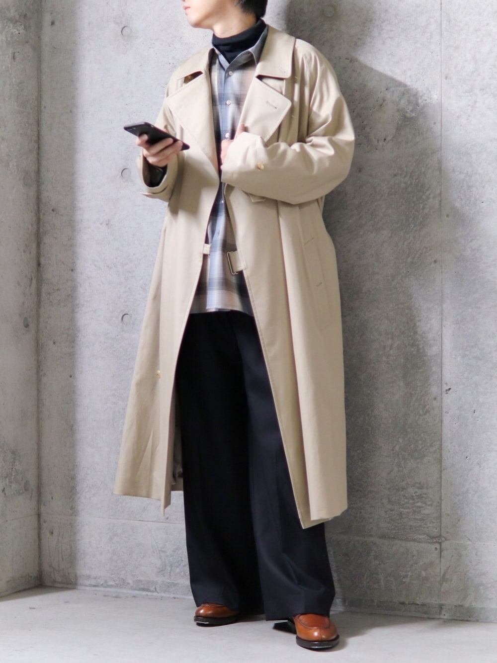 この秋買った CIOTAのタイロッケンコート AURALEEのウールチェックシャツ SUNSEAのワイドストレートパンツ を使ったコーデ。 どれもお気に入り。