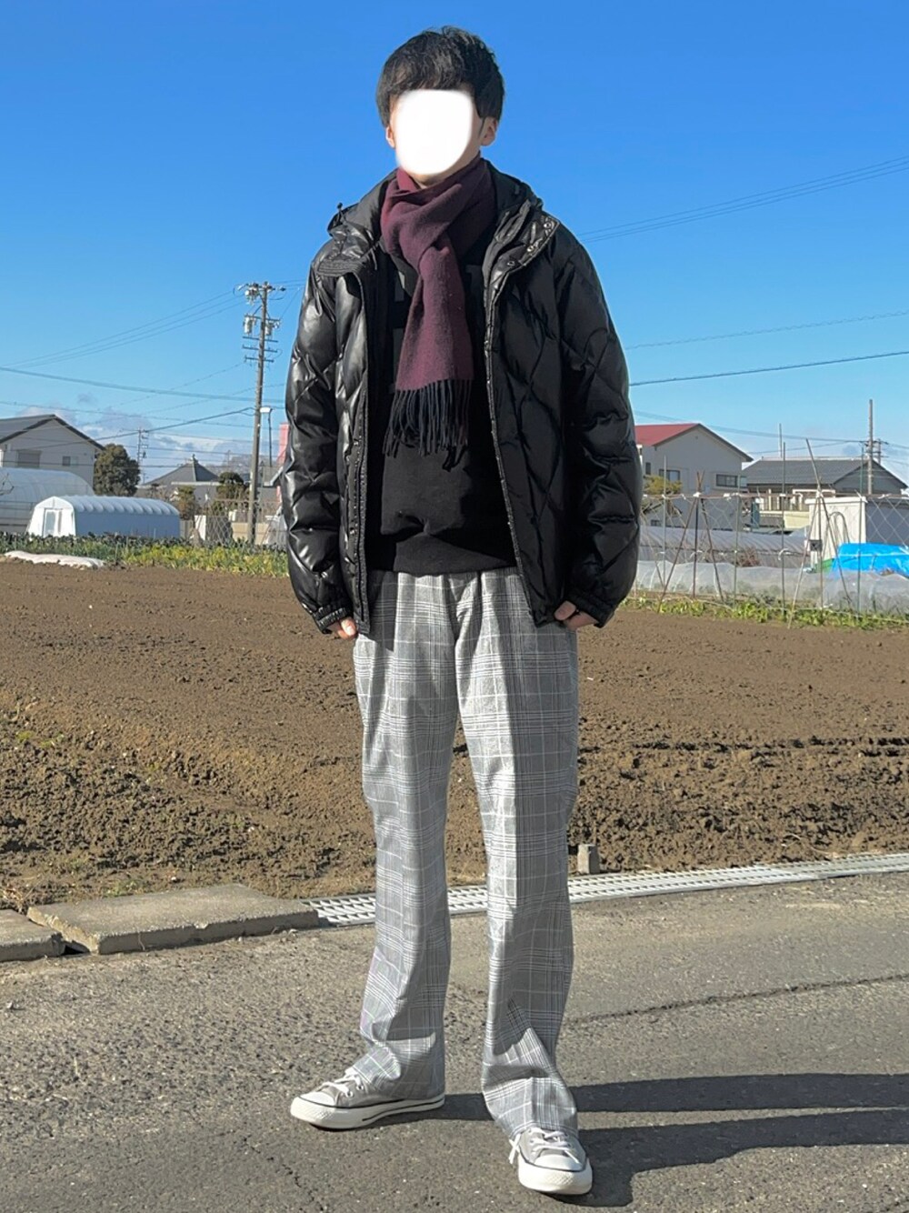 『Today's Koyonate‼️』 寒がりにしか見えないコーヨーネート🥶❄️🍃 はい、撮影のとき冗談抜きで寒いです😰 今日は黒とグレーのモノトーンです♪♤ 差し色でワインのマフラーで寒そうなコーデを華やかにしました☀️🌹 差し色があるだけで一気にお洒落見えしますね❗️