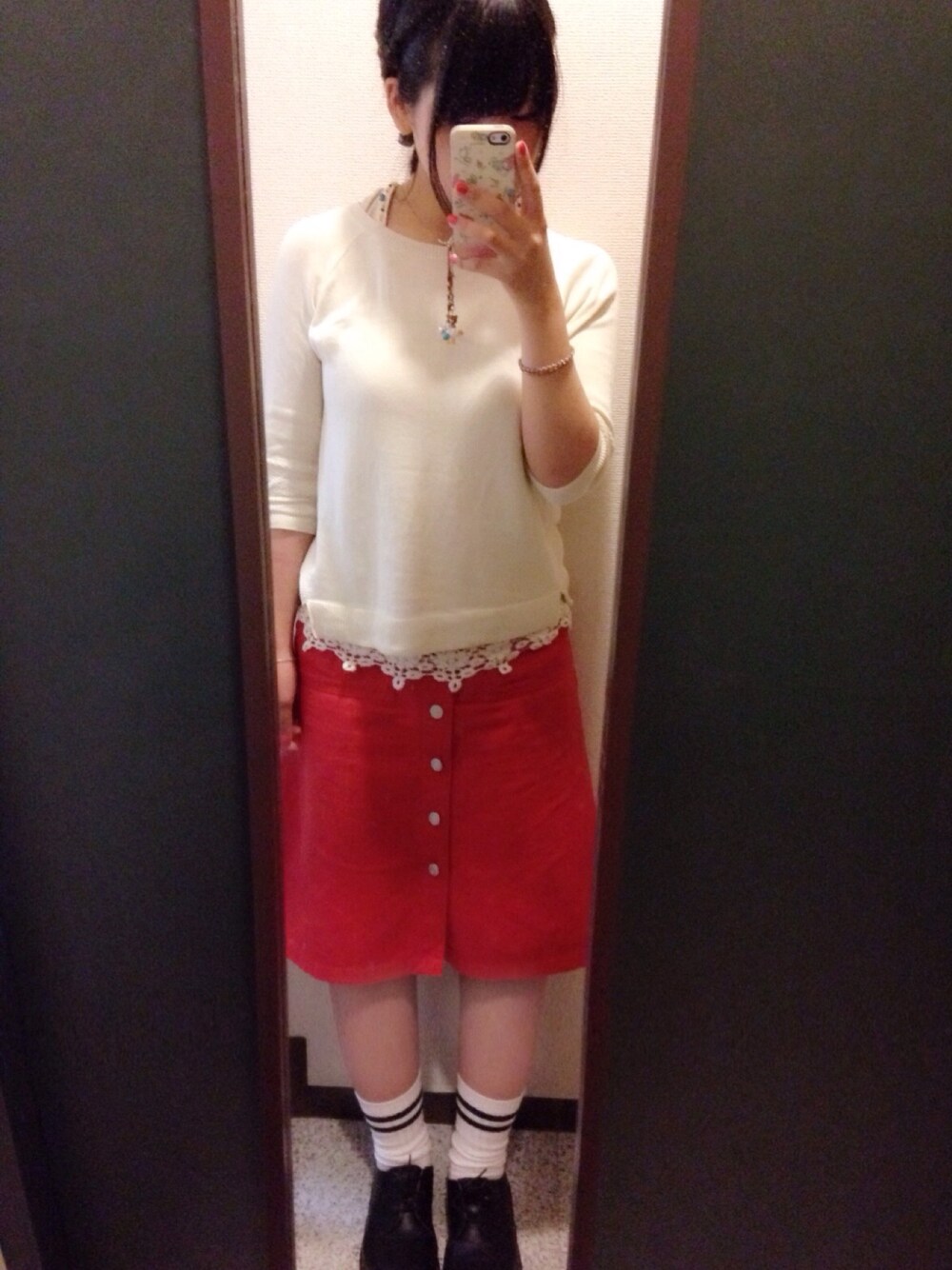 友達とお買い物♪♪ いつも地味色ばっかりだから たまには赤を…と思ったけど、 やっぱりしっくりこない\(^o^)/ O脚はどうやったら治るだろうか…