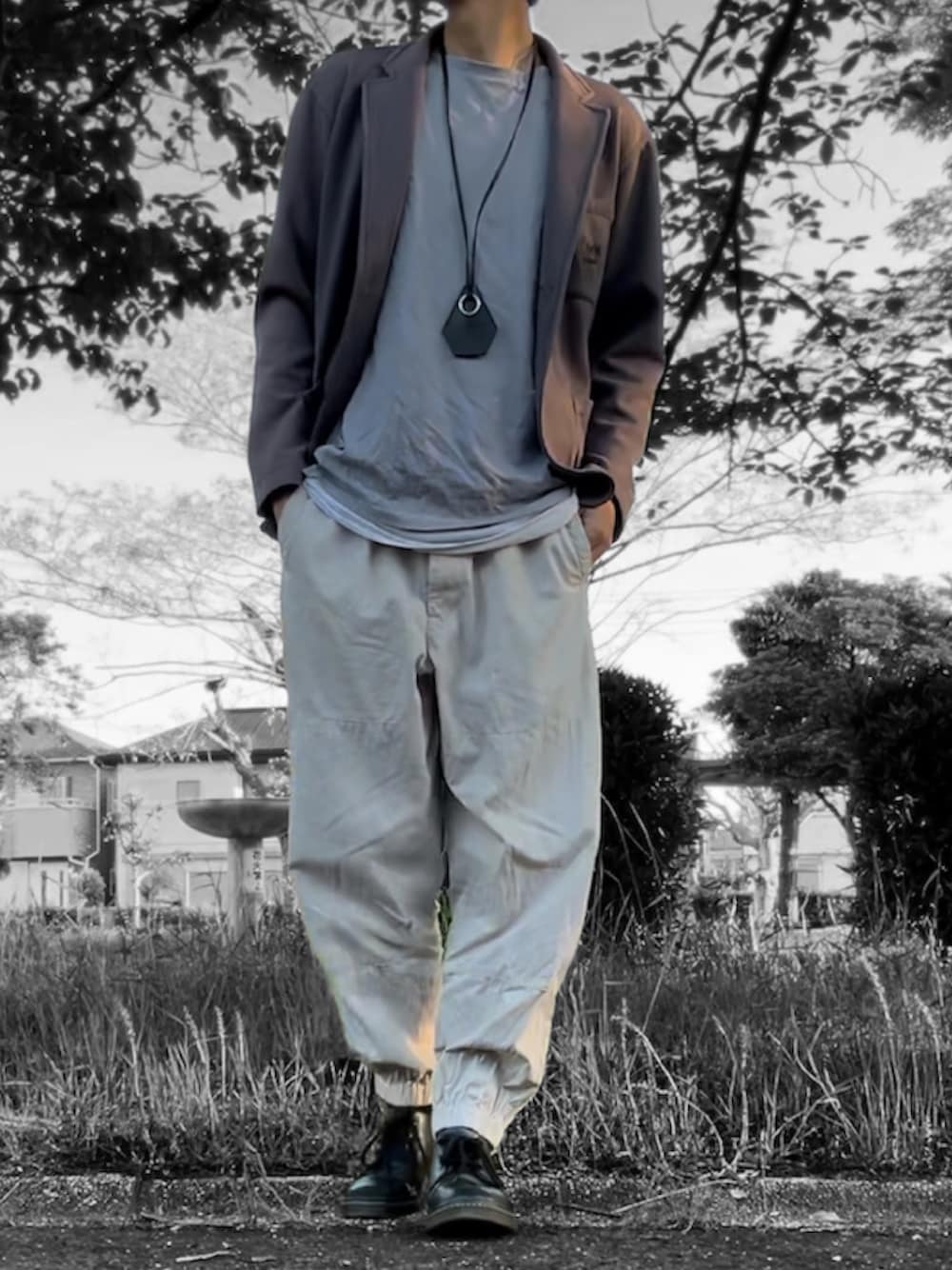 ご覧頂きましてありがとうございます! 淡色コーデのアクセントに 黒のキーネックレスと革靴を。