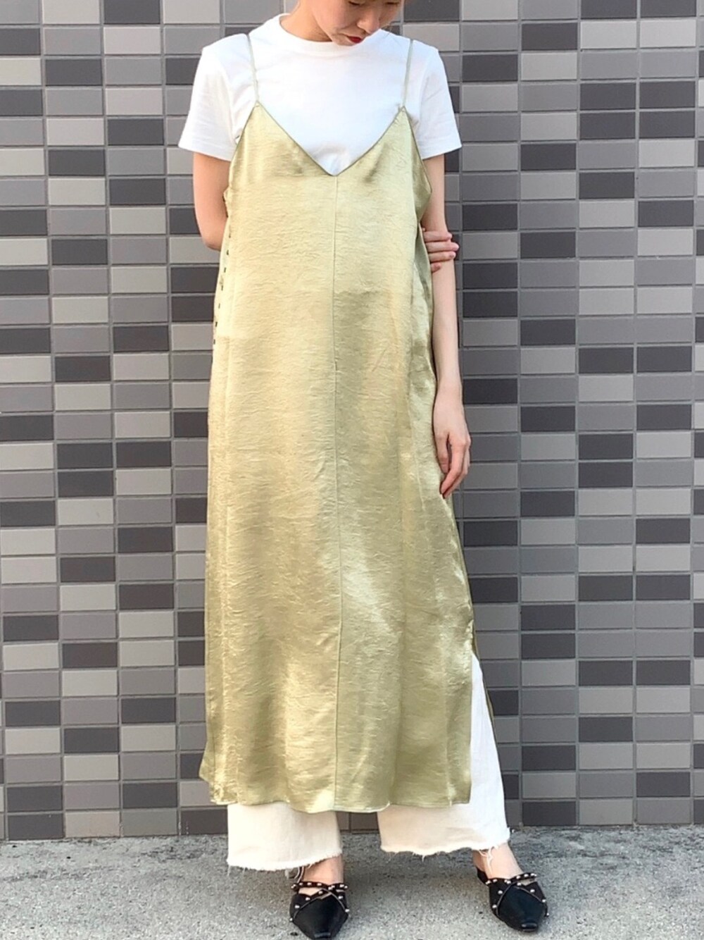 なんとも言えない変わったカラーのサテンキャミワンピ💚 サイドにはボタンがついていてそこもまた可愛い💕1枚できても、レイヤードスタイルでも🙆♀️