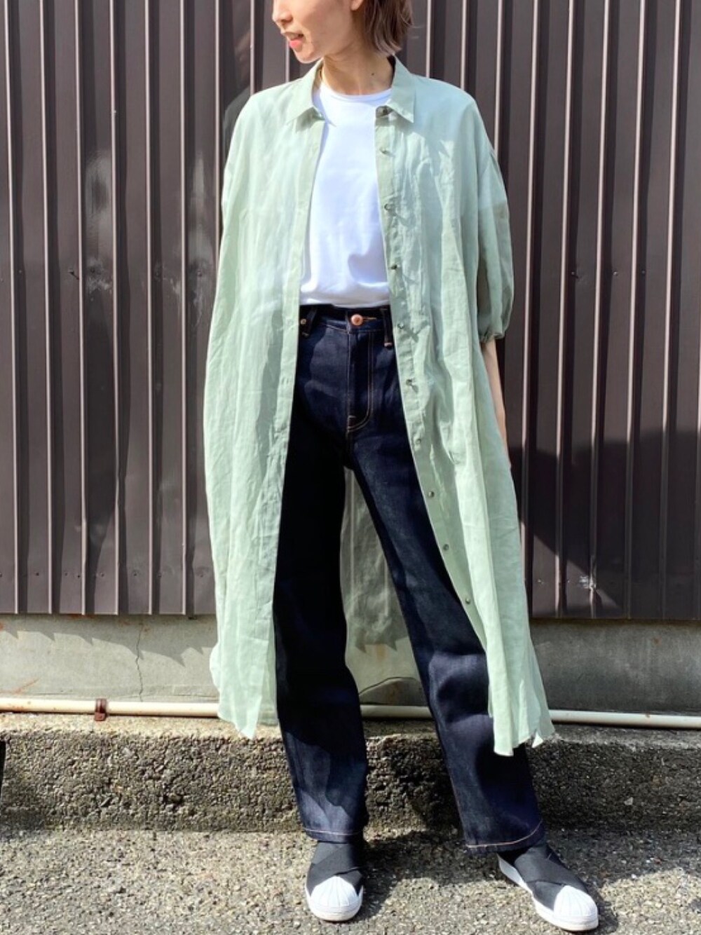 シンプルな白Tにデニムにはロング丈のカラーシャツを羽織って💚 トレンドのシースルー素材ですが、シャリ感のある素材なのでカジュアルに着こなしたい方にオススメです😊