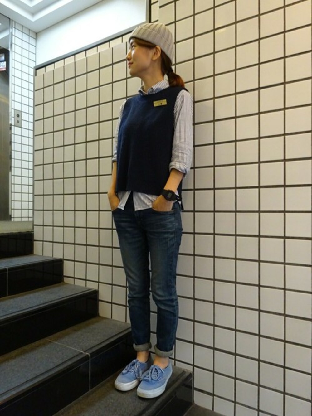 全体的にブルーコーデにしてみました。 何を着ていいか一番悩むこの時期、薄手のシャツで涼しく、ベストで季節感を出しました。 グレーのニットは落ち着いた印象に仕上げてくれます。