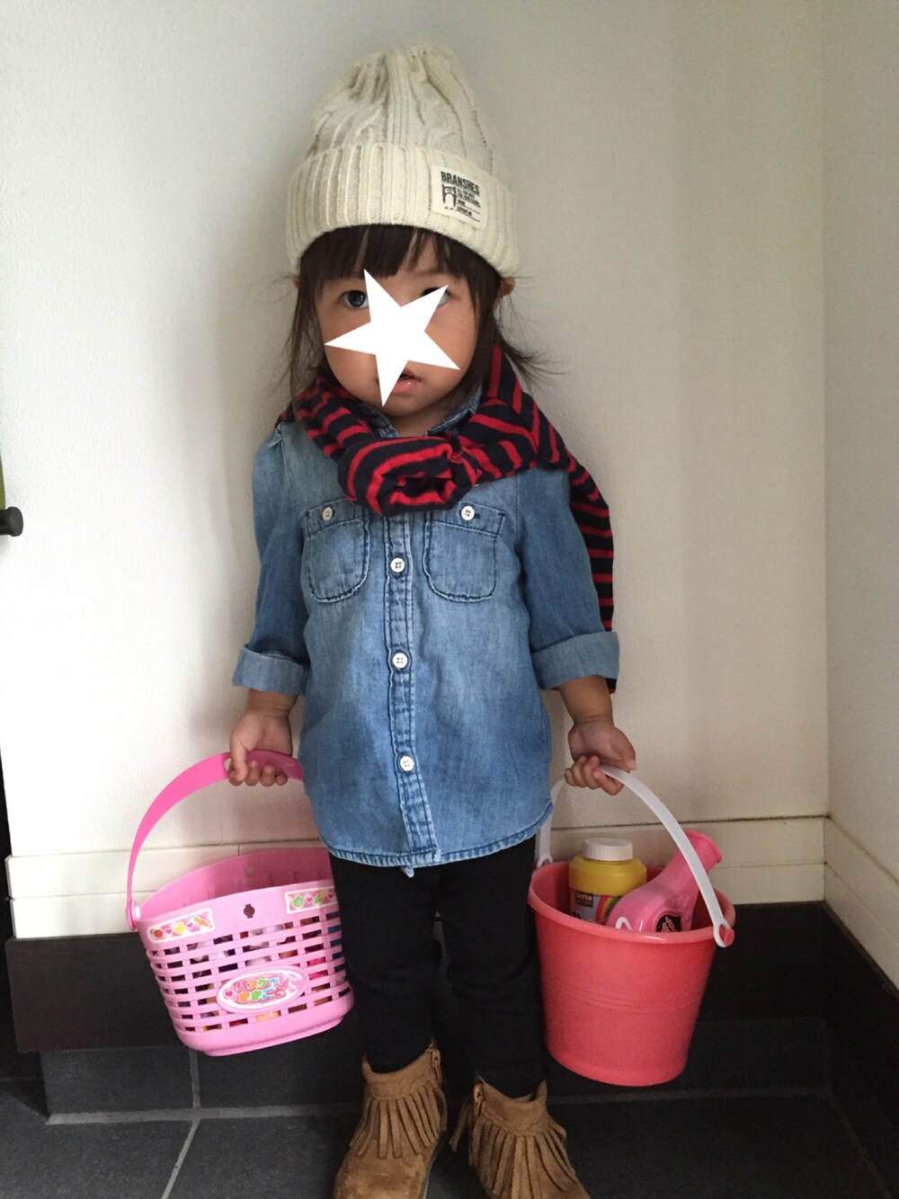 ボーダートップスを着せようとしたら、ものすごく嫌がって着てくれず😥😥 なので、肩掛けしました♡ 天気悪い予報でしたが、晴れてきて暑いくらいなので、ちょうど良かったかな♡ 両手にお気に入りおもちゃと、シャボン玉持ってばぁばのうちへ。 持っていくと聞かないから仕方なく💦 イヤイヤしたら半端ない💨 最近毎日怒ってばっかりだから反省😩😩