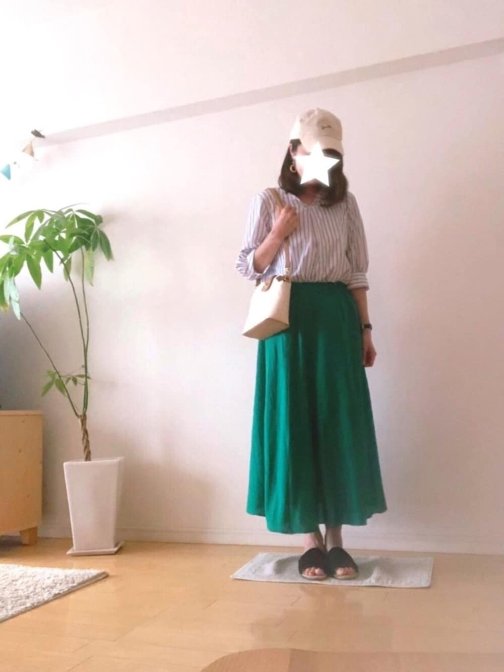 こんにちは🌈 今日も、夏日ですね🏝 色鮮やかなグリーンのお気に入り♪ スカートに形がレトロで可愛い♡ストライプトップス☺️ 水分補給して、熱中症に気をつけましょうね🍹💪✨