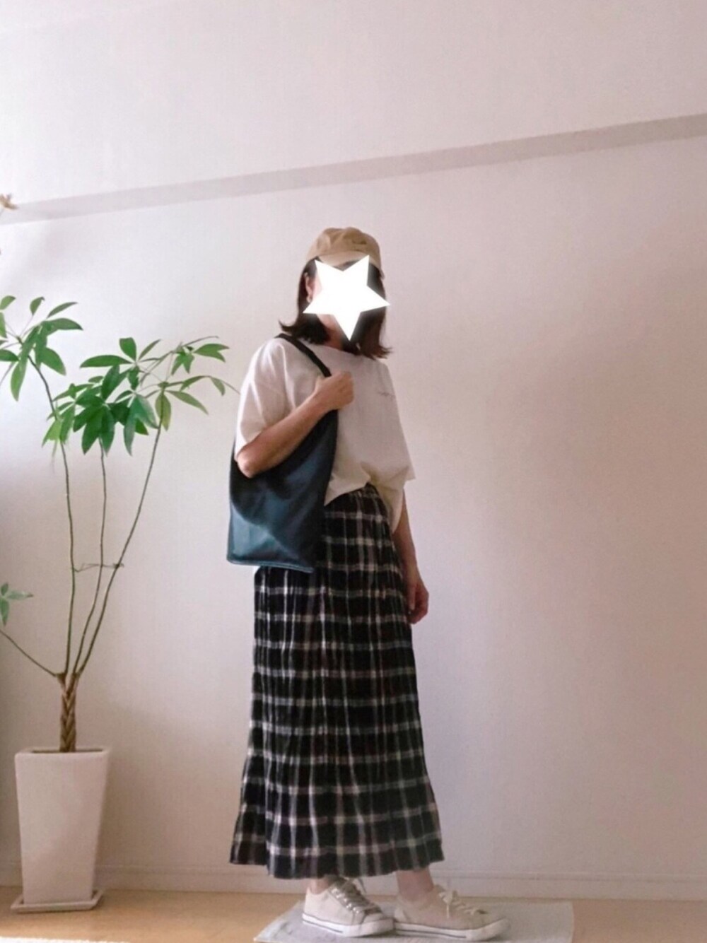 今晩は✨ 久しぶりにキャップを被りました😎🧢 Tシャツのバックには、ロゴが入っていて、柔らかい素材で、楽ちんなスカートコーデ♪