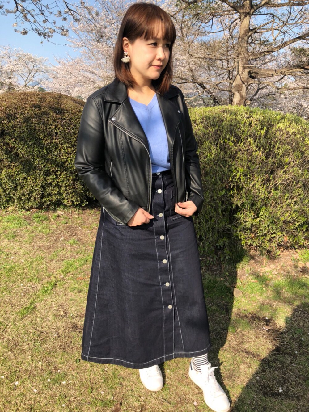 友達と桜を見に行ってきました☺️❤️ GUのデニムスカートやっと履いた~✨ 産後痩せる予定で少し小さめを 買ってたから若干きついけど🤣(笑) 色も形も可愛い😘 あとはイヤリングやスニーカーで 白を取り入れて色味が 暗くなりすぎないようにしてみた❣️ ボーダーの靴下もポイント😋 ちなみにバックは常に マザーズリュックです😂☘(笑) 息子との写メも📷 GUのシャーリングフレア ロングスカート欲しいな~💓