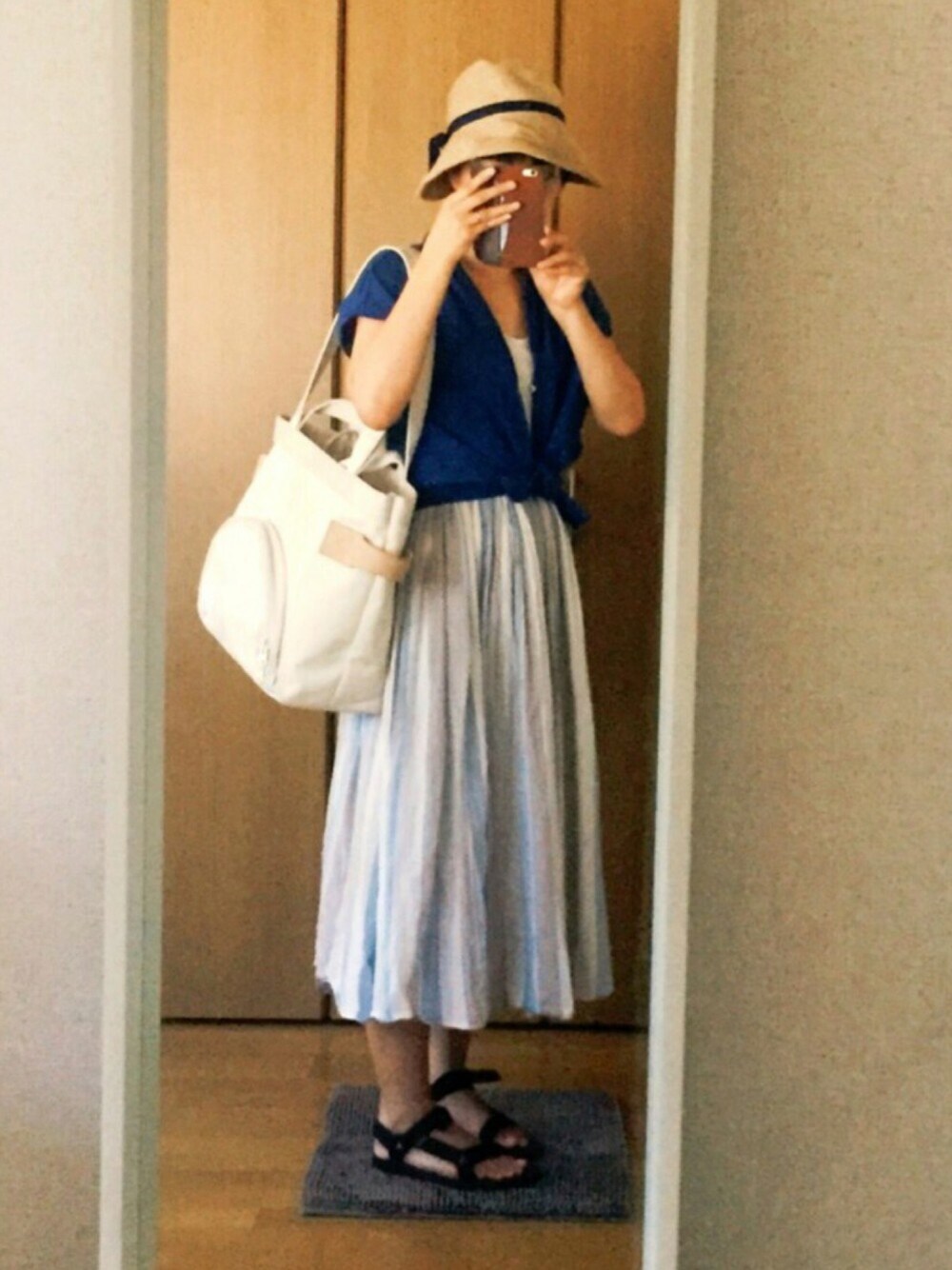 暑いので涼しげなブルーでまとめた夏の休日スタイル。子供と動物園に行ってきます。