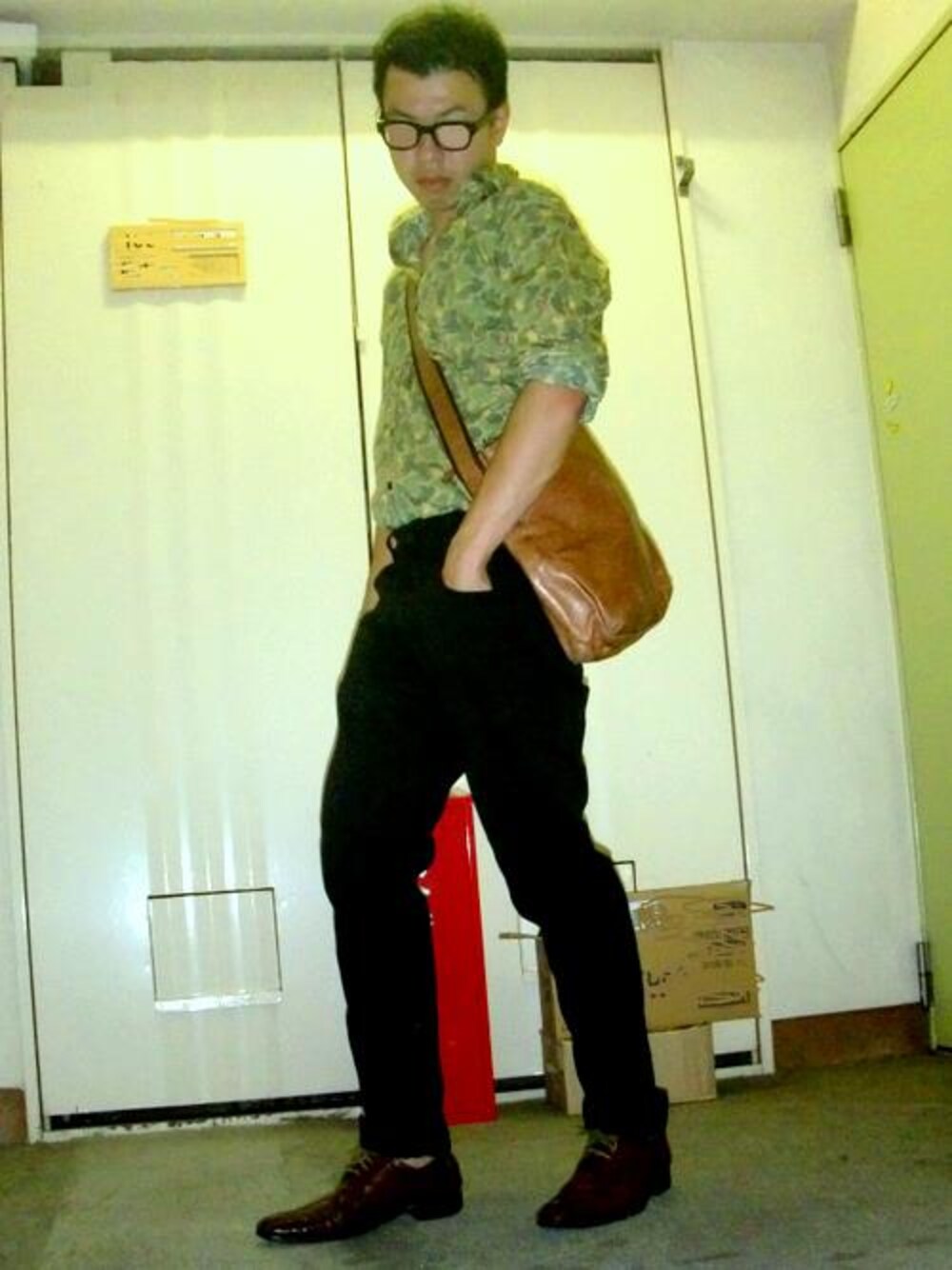 葉っぱ柄の迷彩シャツはお気に入り・・・ バッグは知人からただでもらいました、「これ、本革やでぇ~っ!」と言っていたけど本当かよ・・・