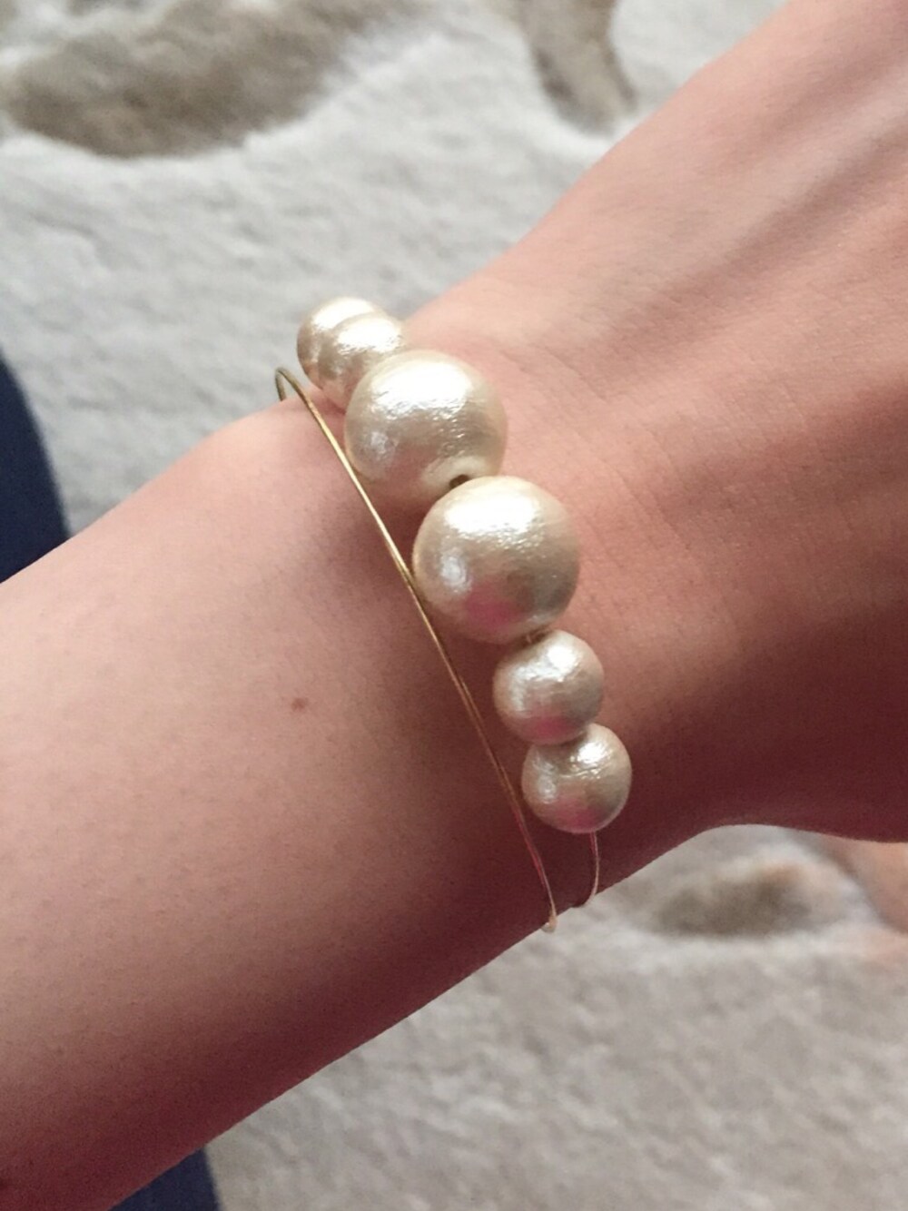 手作りアクセサリー parts Clubで材料を揃えました。 バングルとコットンパールを 接着剤でとめてつくってます。