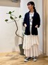 ゆったり楽に着れるジャケット◎ カジュアルにもきれいめにも合わせやすいです^ ^ こちらのティアードスカートは かなりボリュームがありウエストがゴム仕様で履き心地もすごくいいです◎ 透け感もあまり気になりません^ ^