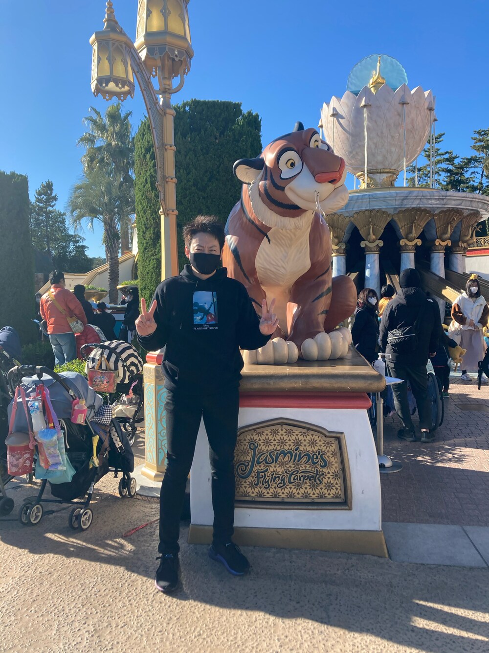 最近、オープンしたばかりのディズニーフラッグシップストア東京オリジナルのパーカー❣️オールブラックコーデで大人なスタイルに、足元はもちろんブーストで笑