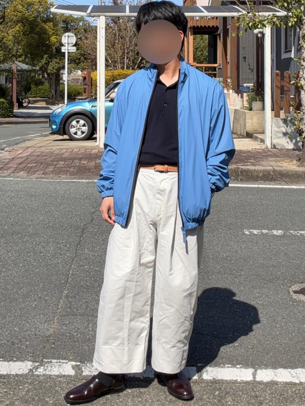 ZARAの青ジャケット、UNIQLOのニットポロセーター、WYM の白タックワイドパンツを使って明るめモノトーンコーデを組んでみました。 またベルトはUNIQLOのベージュカラーのベルトを使ってコーデ 全体の差し色として加えてみました。