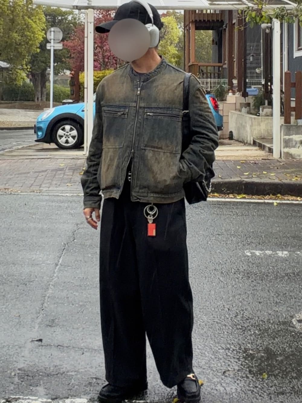 WYMのVINTAGE WASHED DENIM ZIP MOTO JACKETとGUのスーパーバギースラックスとHender Schemeのキーリングを着用してみました。