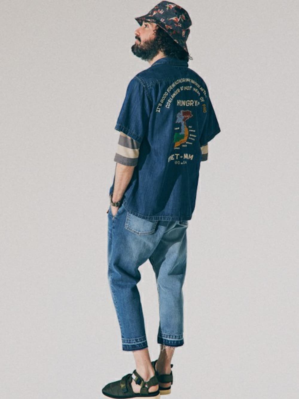 スーベニアライクなオープンカラーシャツと、袖にプリントを加えた5分袖Tシャツとのレイヤードコーデです! トレンドギミックを取り入れつつKRIFF MAYERらしさを表現しました!