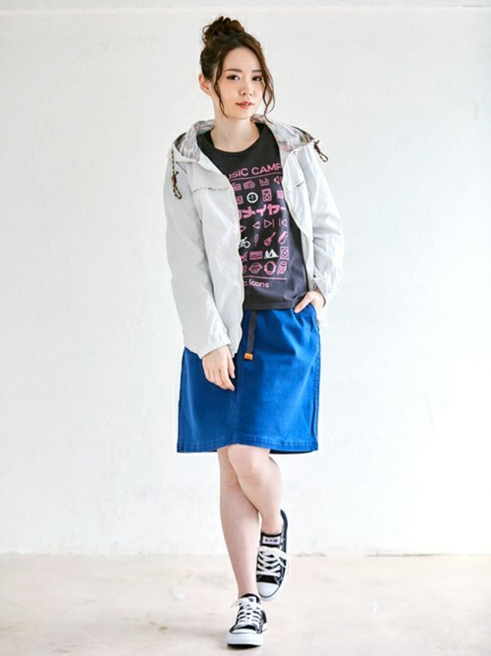 カタカナロゴがユニークなプリントTを主役に、POPなアウトドアコーデにしてみました♪ 使いやすいダークブルーとホワイトが爽やかなマンパを合わせて涼しげにまとめました。