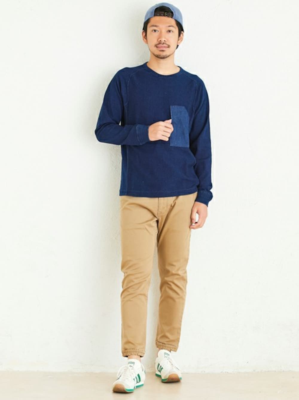秋の立ち上がりコーデです! デニムの風合いを持たせたインディゴ染めのロンTEEは、スウェット型フリーダムスリーブデザイン! 脇にも切替を加えたアメカジライクなアイテムです! ボトムスは足元スッキリなジョガーパンツ。 スニーカーと合わせれば秋のお出かけにもピッタリです!