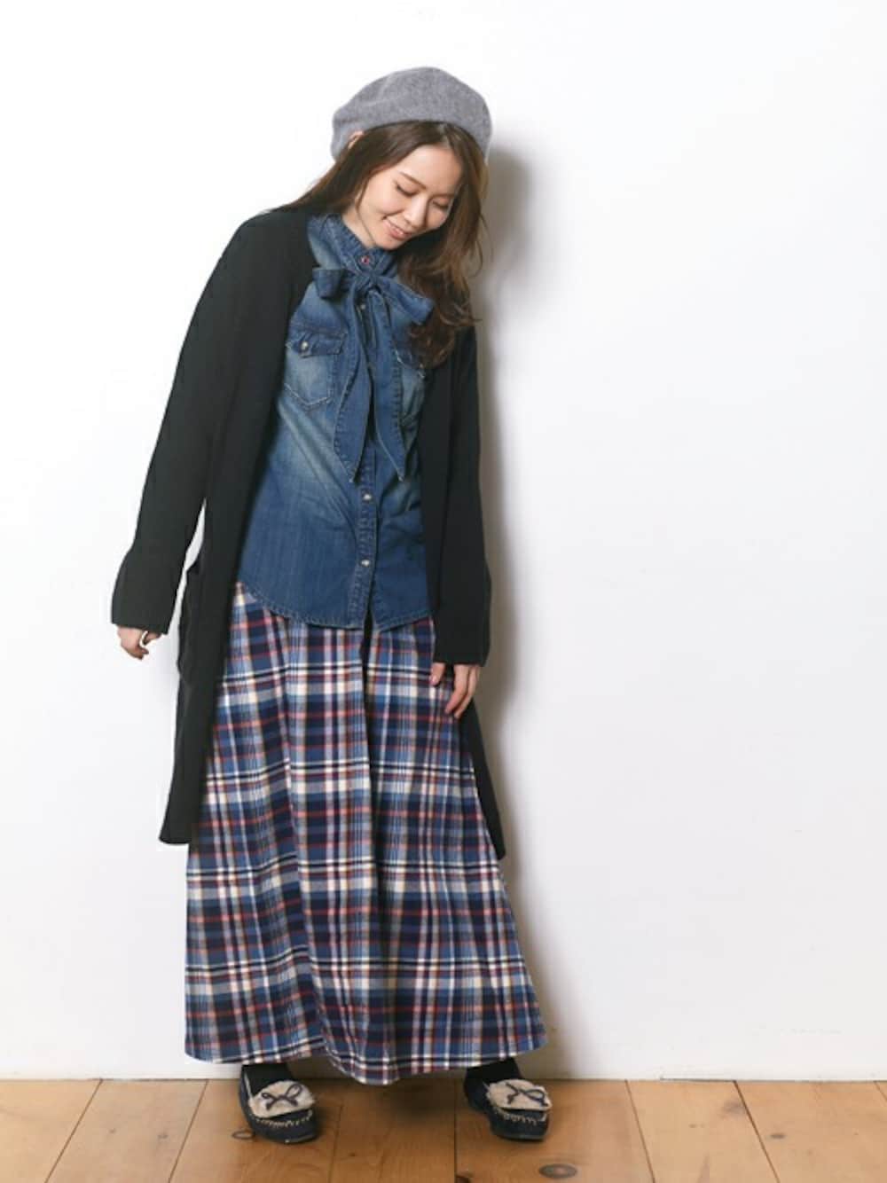 ほっこりチェックがあたたかな印象のロングスカートをメインに、 リボンタイのデニムシャツを合わせ、黒のロングカーデで引き締めた、大人可愛い秋冬コーデにしてみました。