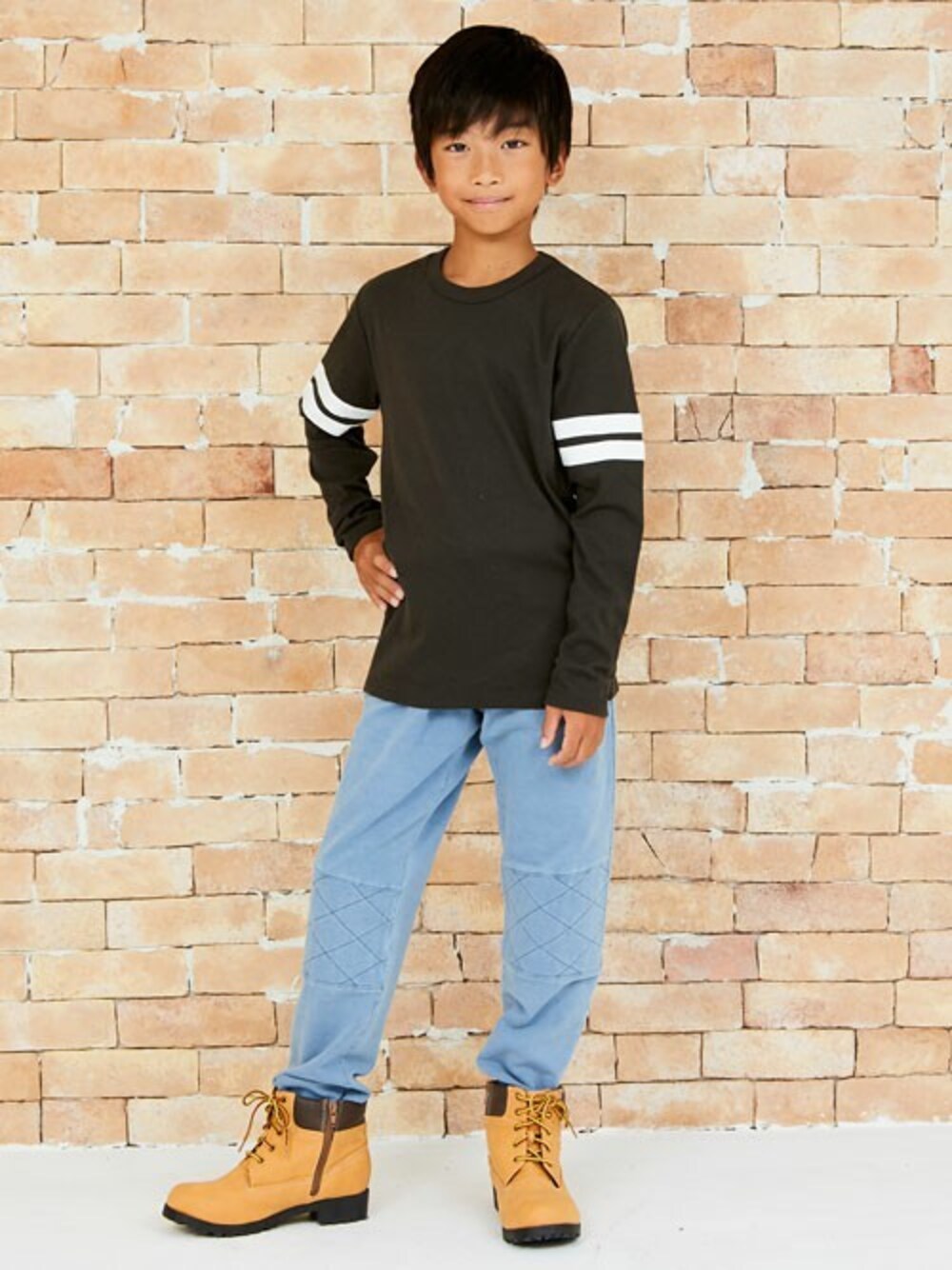 肌寒くなってきた今時期や、インナーにもオススメなシンプルTシャツ! 袖のラインがスポーティーな印象に☆ ボトムスは柔らか生地なのに丈夫で動きやすい! 涼しくなってきた今こそ遊びたい!そんなキッズにオススメのコーデです♪