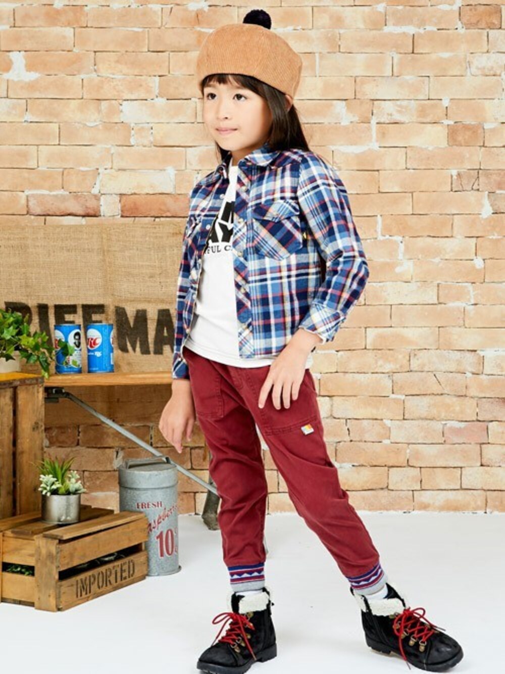 ロゴロンTの上にチェックシャツを羽織り、でこぽんベレーを頭にのせて、鉄板コーディネートを可愛くアレンジ! ボトムスは裾リブタイプのストレッチパンツをチョイスして軽快に♪