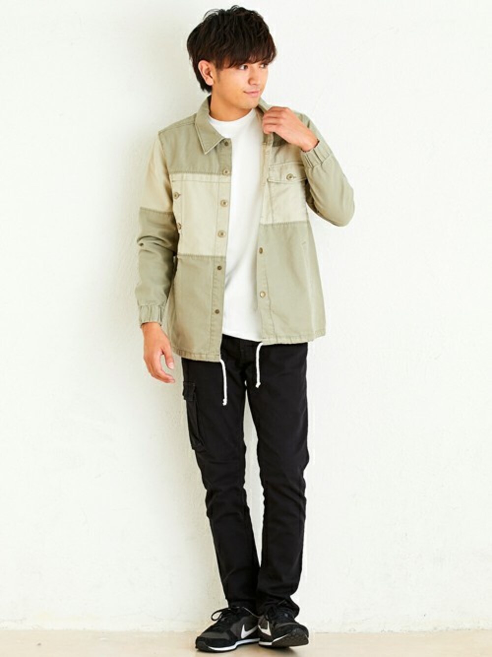 リメイク風デザインのコーチジャケットコーデです。 胸の位置の切替がアクセントになっていて、フロントのボタンにも変化を加えています! ボトムスは足元スッキリなスリムカーゴパンツ。 片ポケデザインなので様々なスタイリングに取り入れやすいアイテムです!