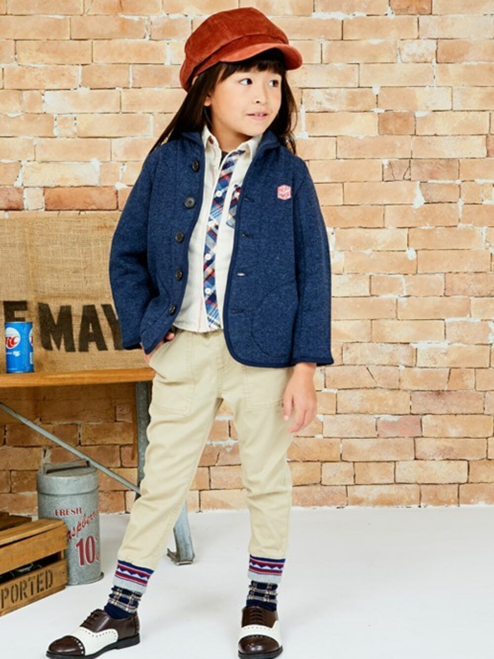 ツイードのような風合いがある、柔らかなカットジャケットをメインに、各所にポイントアクセントを加えたコーディネート! 前立てがチェックに切り替わったシャツ、裾リブにネイティブ調の柄が入ったボトムスで差をつけちゃいます♪ コーデュロイのキャスケットでかわいらしさが更にアップ!