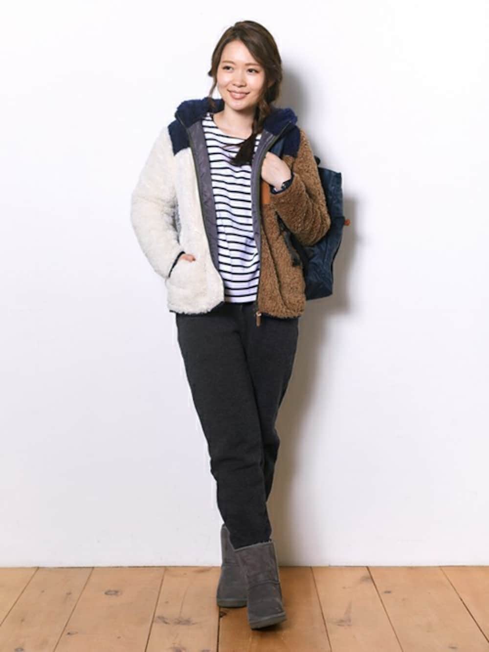 ふわもこのシャギーフリースジャケットをメインに、暖かアウトドアコーデにしてみました♪ パンツはスウェット地よりも高見えする、カットツイード生地なのでカジュアルさを軽くし、コーデを品良くまとめてくれます◎
