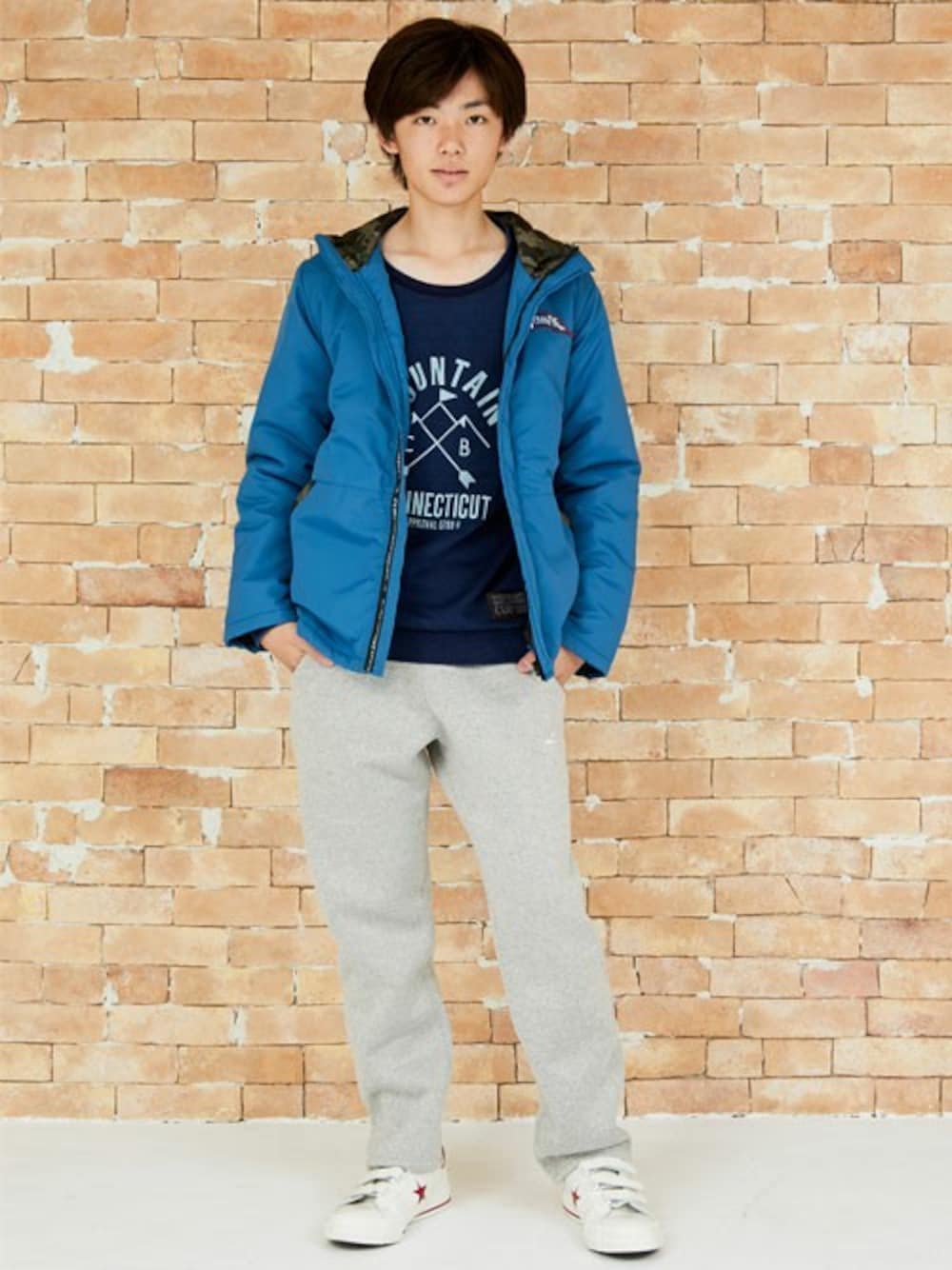 フード裏の迷彩柄がおしゃれな、防寒性に優れたアウターは、 高学年のお兄さんも着やすいデザイン♪ ボトムスは程よいハリがあり、ダボっとせずにスタイリッシュなシルエットに! 優しい冬カラーのコーデにしました☆