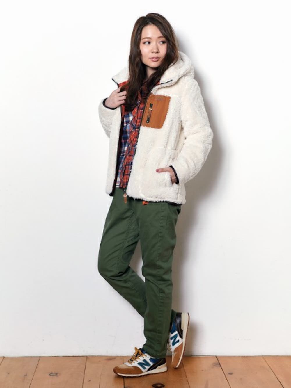 ふわふわで暖かいシャギーボアのジャケットは、フード付きなので顔周りまで暖か◎ チェックシャツとクライミングパンツを合わせて、カジュアルなアウトドアコーデにしてみました♪
