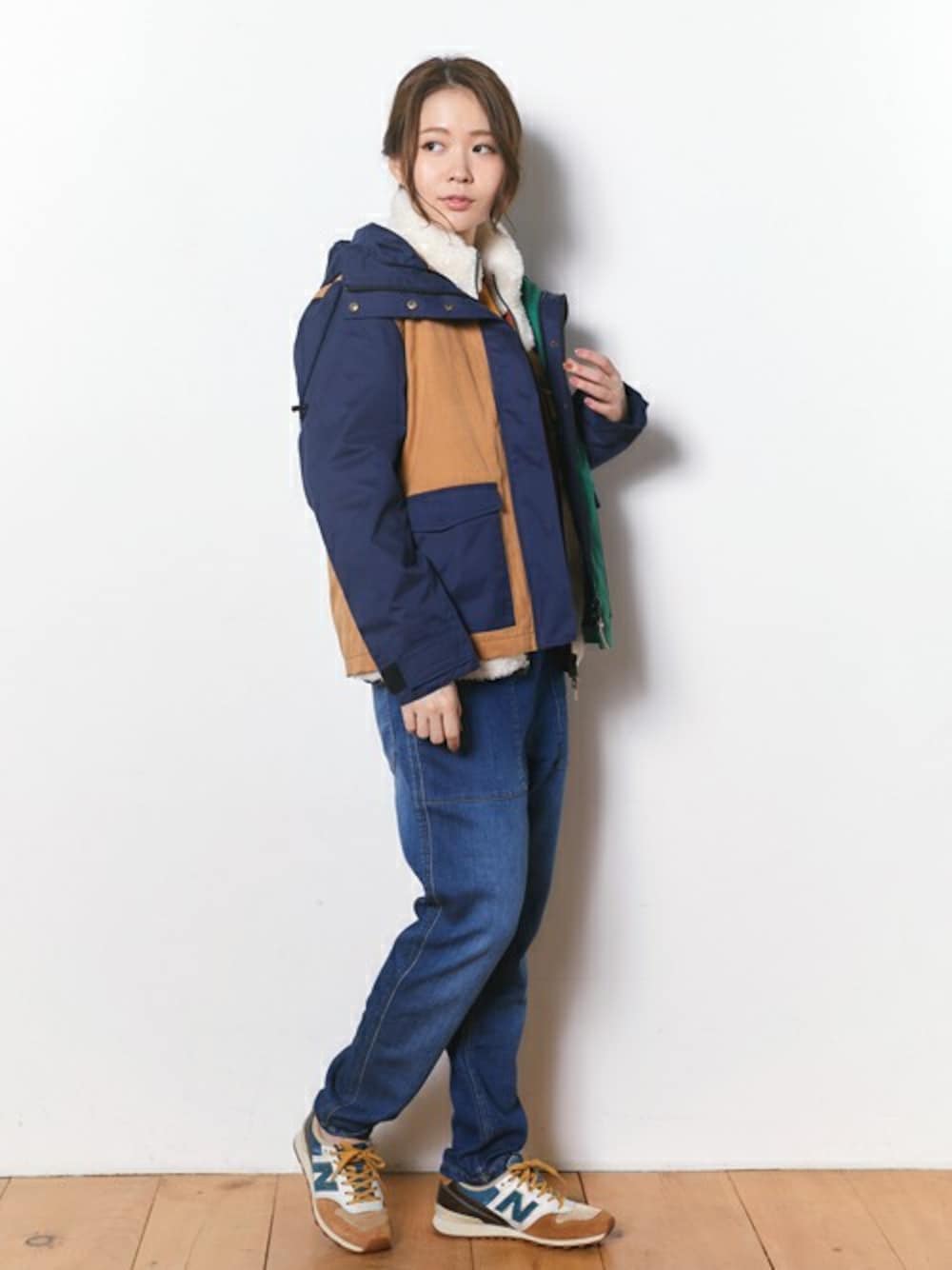 カラフルな配色が目を引く、マウンテンパーカーを主役にしたアウトドアコーデにしてみました♪ ボアベストと重ね着して、暖かさも◎