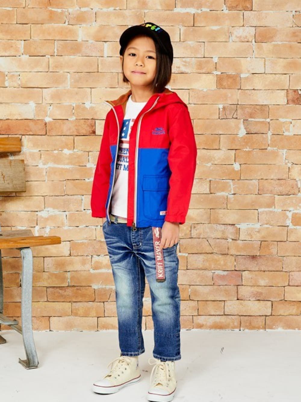 カラフルな切替ウィンドブレーカーに星条旗プリントのロンTとデニムをあわせました! ボトムスのベルトは、実はフェイク?! 本物のように見える、別生地を縫いつけたベルトなので、走ったり、飛び跳ねても安心♪ 季節の変わり目に最適なコーデです。