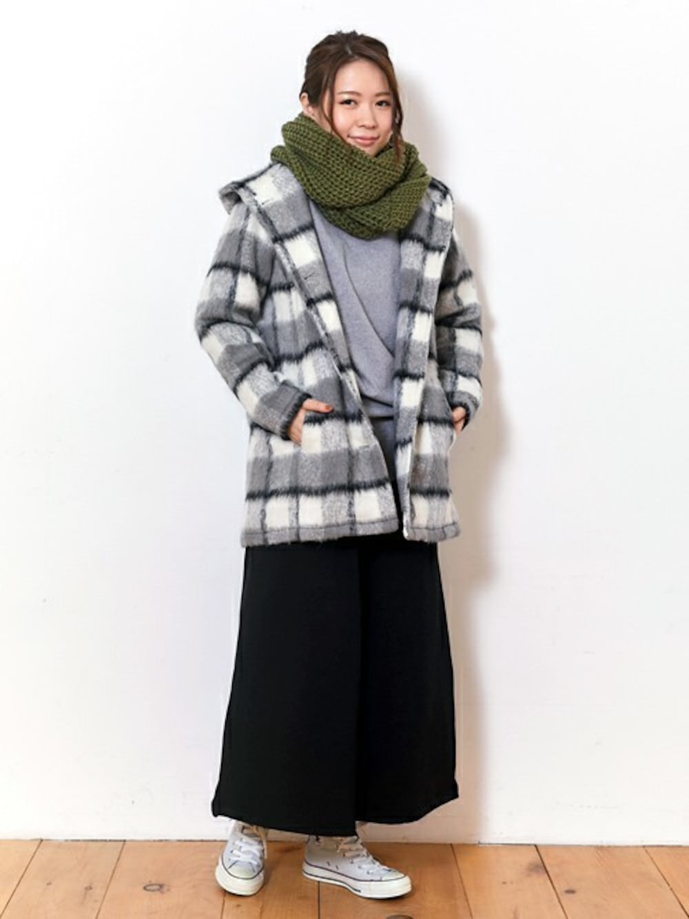 毛足の長いシャギーチェックのコートは、ちょっと珍しいアイテムです♪ 差し色のスヌードと裏起毛のあったかボトムをチョイスして、カジュアルな防寒コーデにしてみました◎