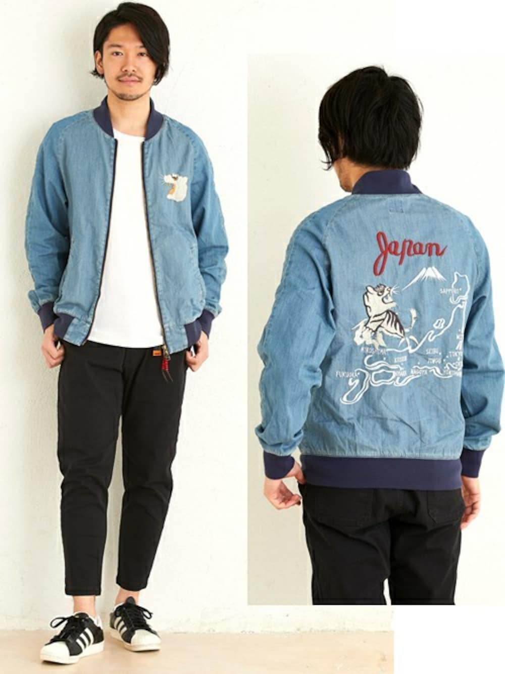 春にピッタリなライトオンスデニムを使ったスカジャンです! 背中に施された刺繍がポイントになっています。 ボトムスは足元スッキリなクライミングナローパンツ! スニーカースタイルにオススメな1本です!