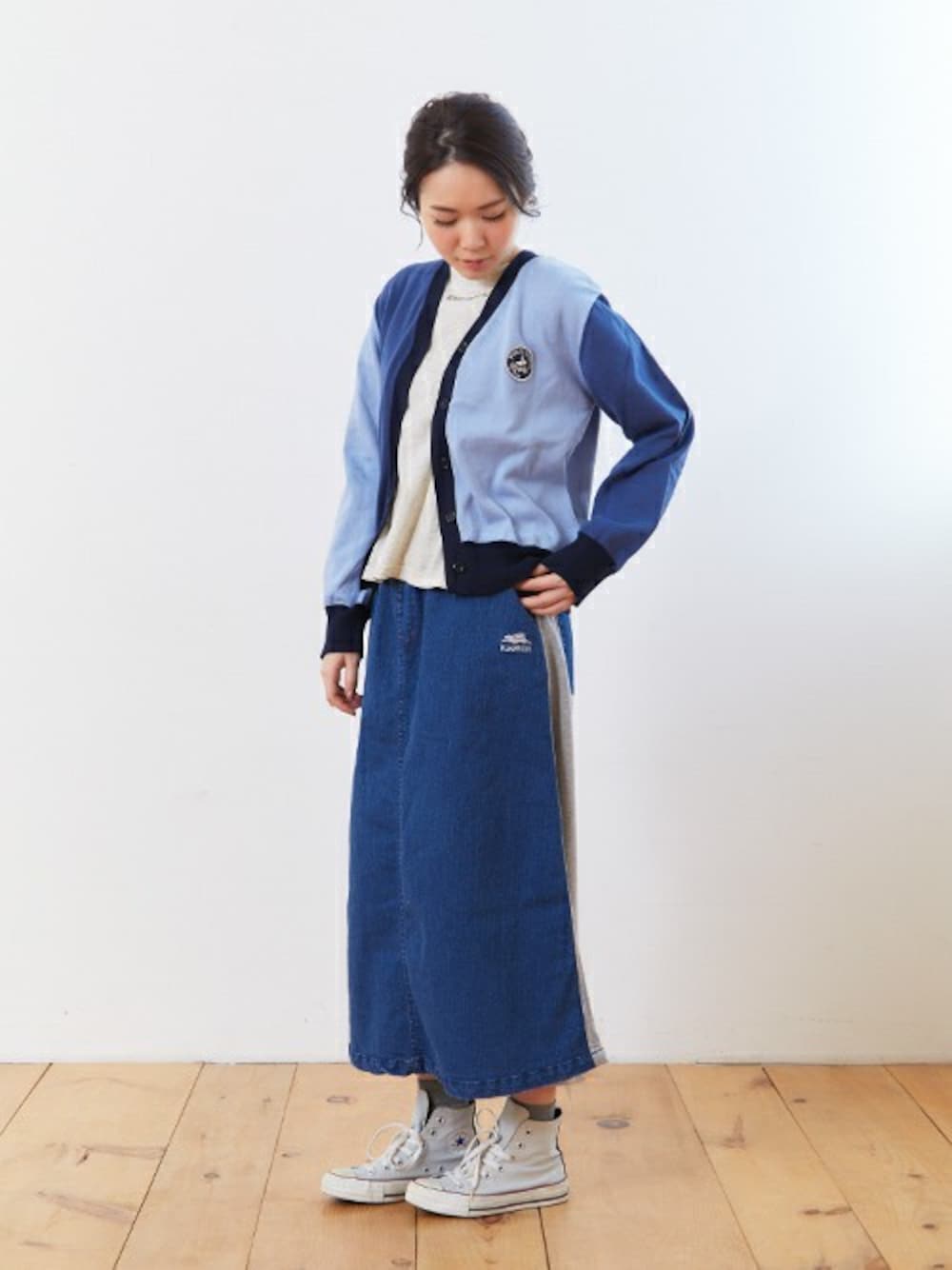 切替たっぷりの遊び心のあるコーデにしてみました♪ スウェット切替のデニムスカートは、動きやすくてオススメです^^◎