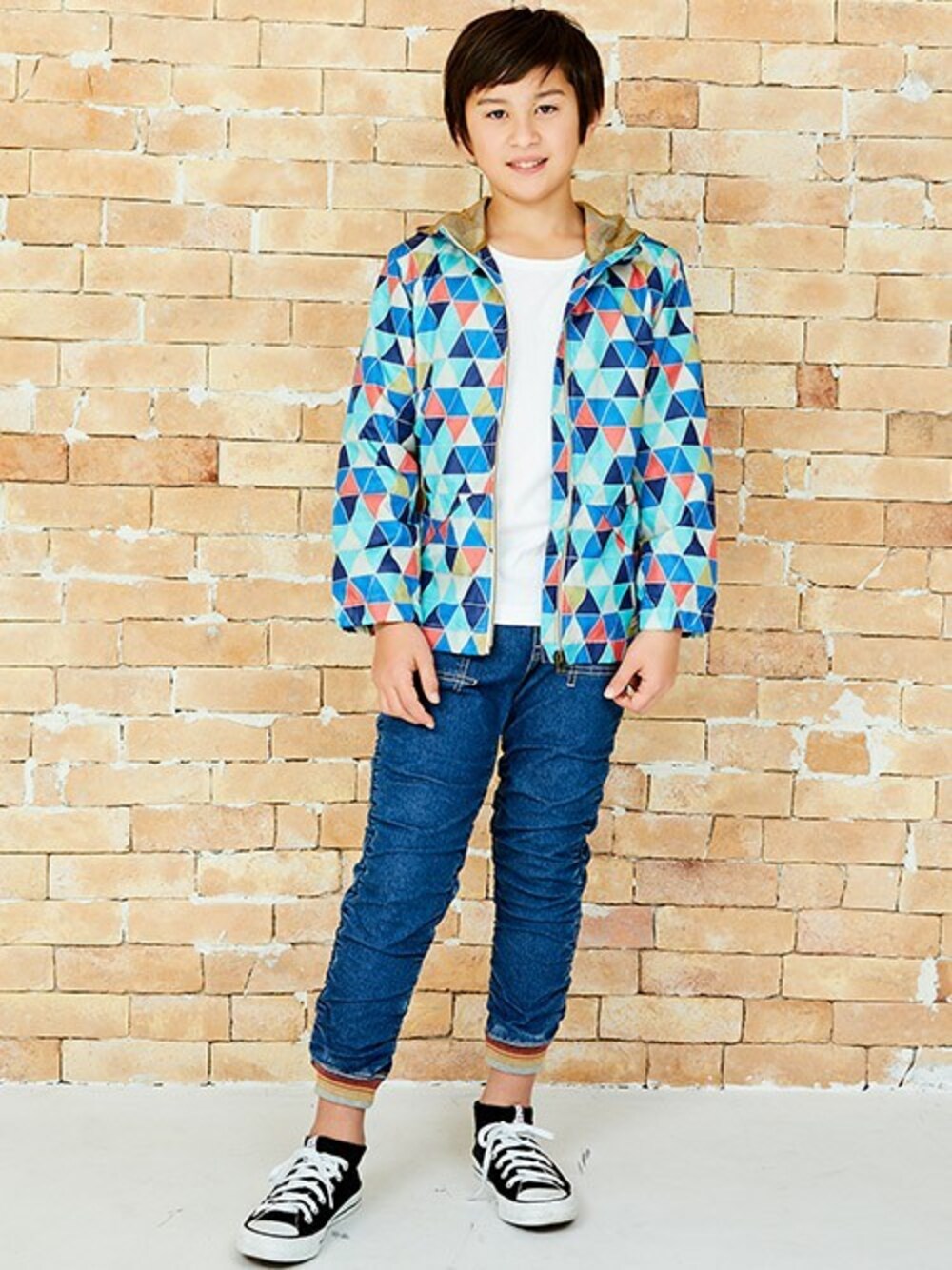 春らしい色の三角形を、カラフルに配置した、シャカシャカジャケットでコーディネート! 撥水効果もあり、ちょっとした雨なら大丈夫。 裾リブのデニムと合わせて、軽快なおしゃれ感が◎