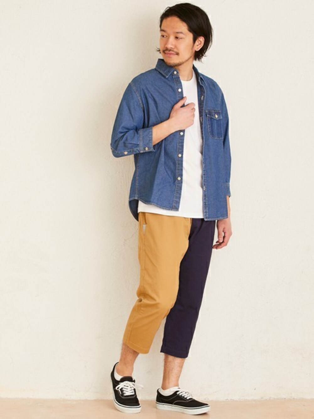 今の時期にオススメな7分袖シャツコーデです! ボトムスはクレイジー配色が個性的なクロップドパンツ。 暑くなってシャツを脱いでも、Tシャツスタイルに映えるボトムスです!