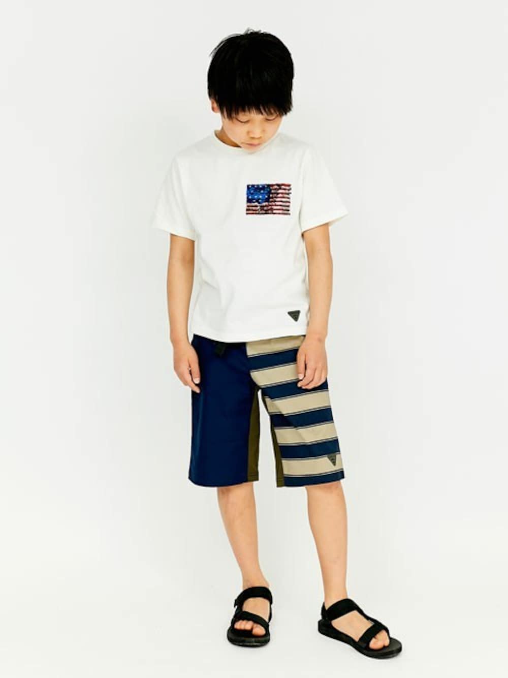 シンプルな白Tシャツに星条旗のワンポイント♪ 実はこの星条旗、下から上へなでるとモノクロに変わります! 遊び心いっぱいのTシャツで、夏を楽しめるコーデにしました!