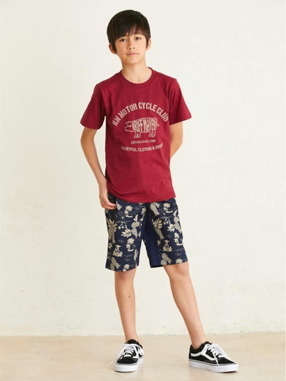 アロハな柄のショーツがアクセント! Tシャツにはさり気なく「ブタ」がデザインされており、ちょっと可愛らしくてユニーク♪ 夏を思い切り楽しめるコーデにしました!
