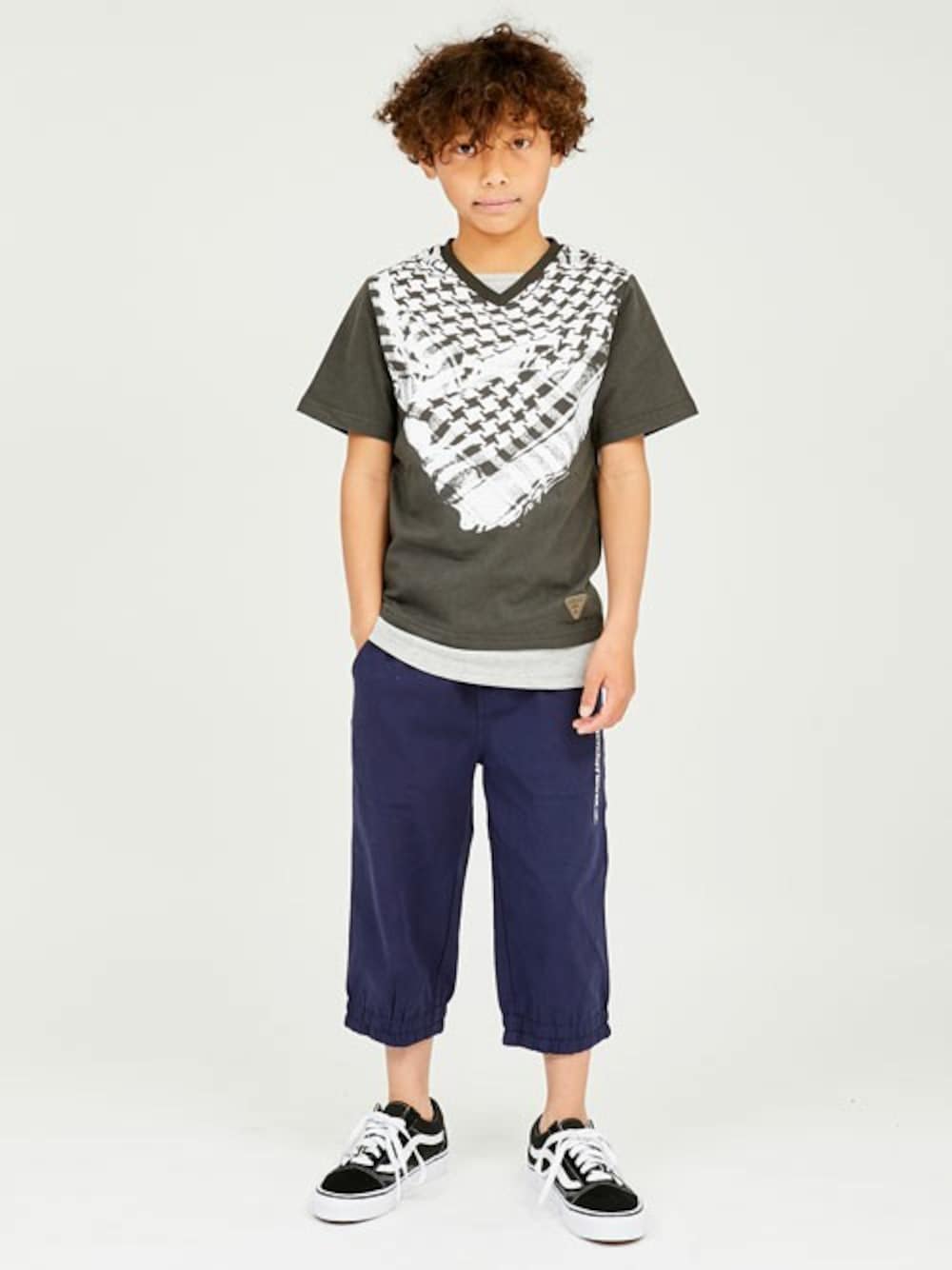 首にスカーフを巻いているようなデザインTシャツが目を引きます! クロップド丈のボトムスは、裾口にゴムが入っているので丈感を調節できる優れもの♪