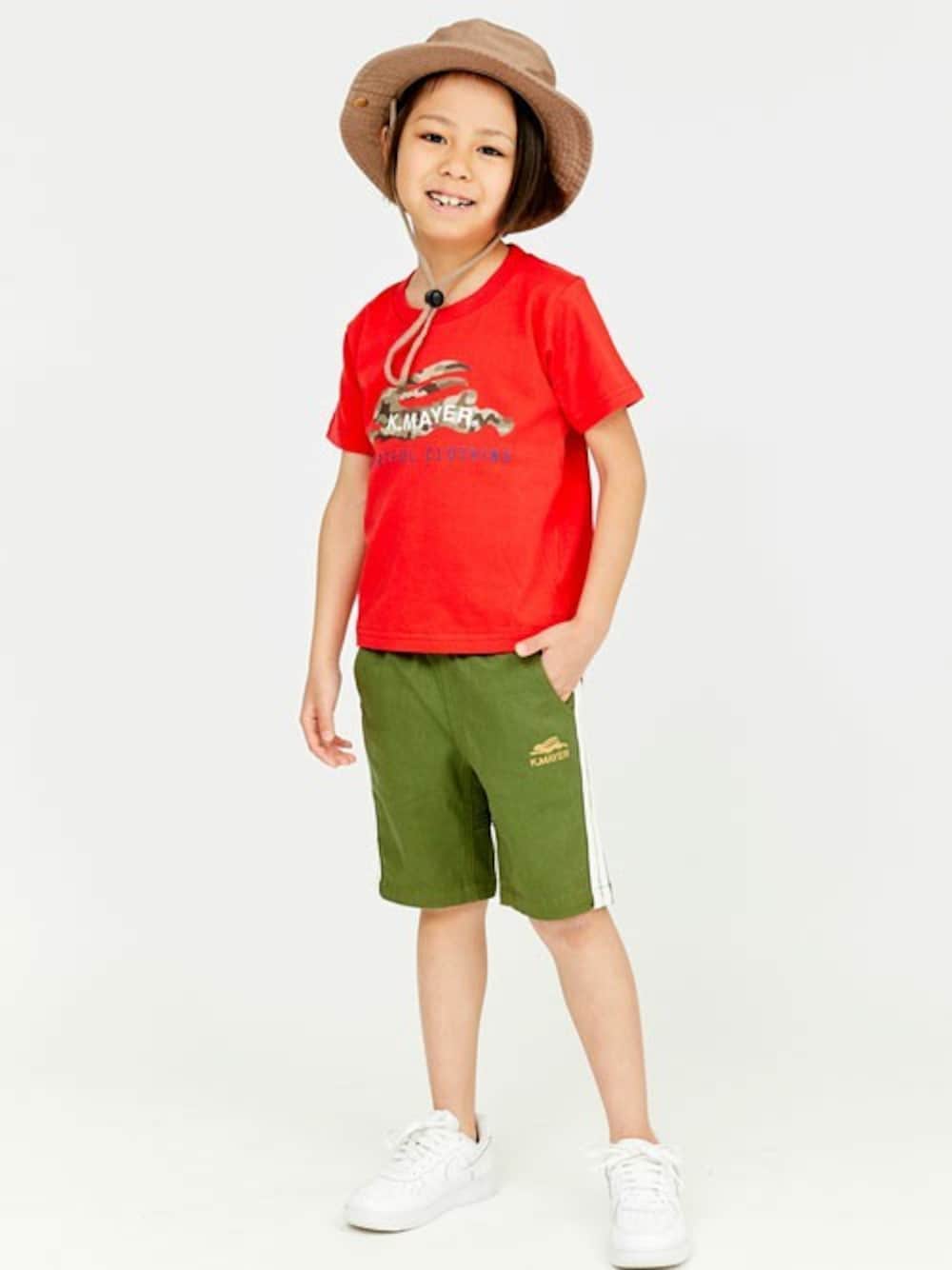 フライングラビットにカモフラ柄をあしらった、ロゴTシャツ! サイドライン入りのハーフパンツとサファリハットでおしゃれにまとめてみました♪