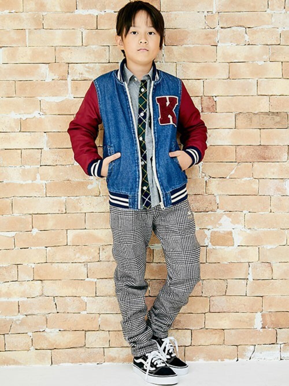 アメカジ×トラッド=アメトラスタイル! トレンドのチェックパンツがポイント。 袖をワインカラーで切り替えたデニムスタジャンが、パッと見のインパクトをアップしています。 インナーに着ているシャツの前立て部分のチェック柄も、コーデにアクセントを加えてくれます。