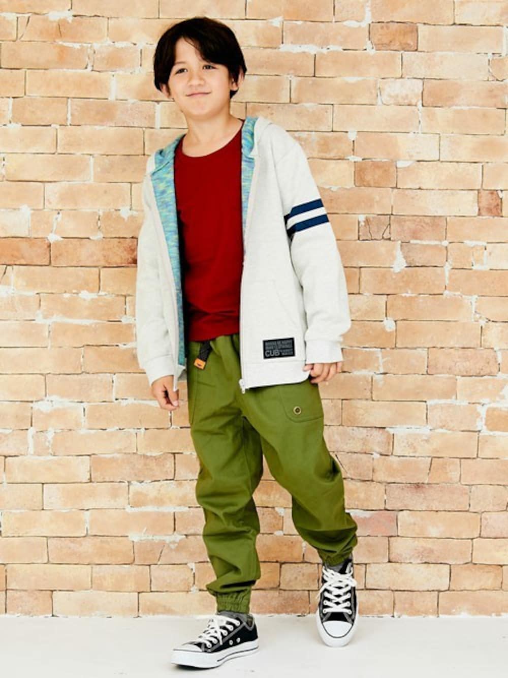 カラフル裏毛のパーカーは、着て楽しい見て楽しい♪ 表はシンプルなデザインなので、高学年のお兄ちゃんでも着やすい◎ 季節の変わり目にピッタリなコーデにしました!
