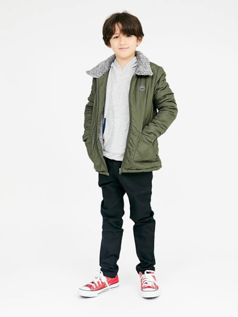 キルティングのジャケットで、ちょっとオシャレな着こなしに♪ 襟部分まであるボアは柔らかくて防寒性も◎ 赤色のスニーカーで、コーデに差し色をプラス!