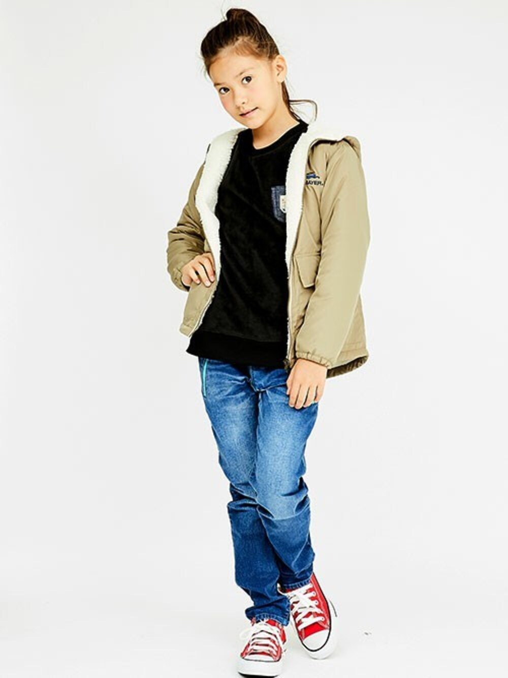 軽くてあたたかいシャカシャカ素材の裏ボアジャケット! インナーはシンプル、ボトムスは加工感の強いデニムでまとめてみました♪