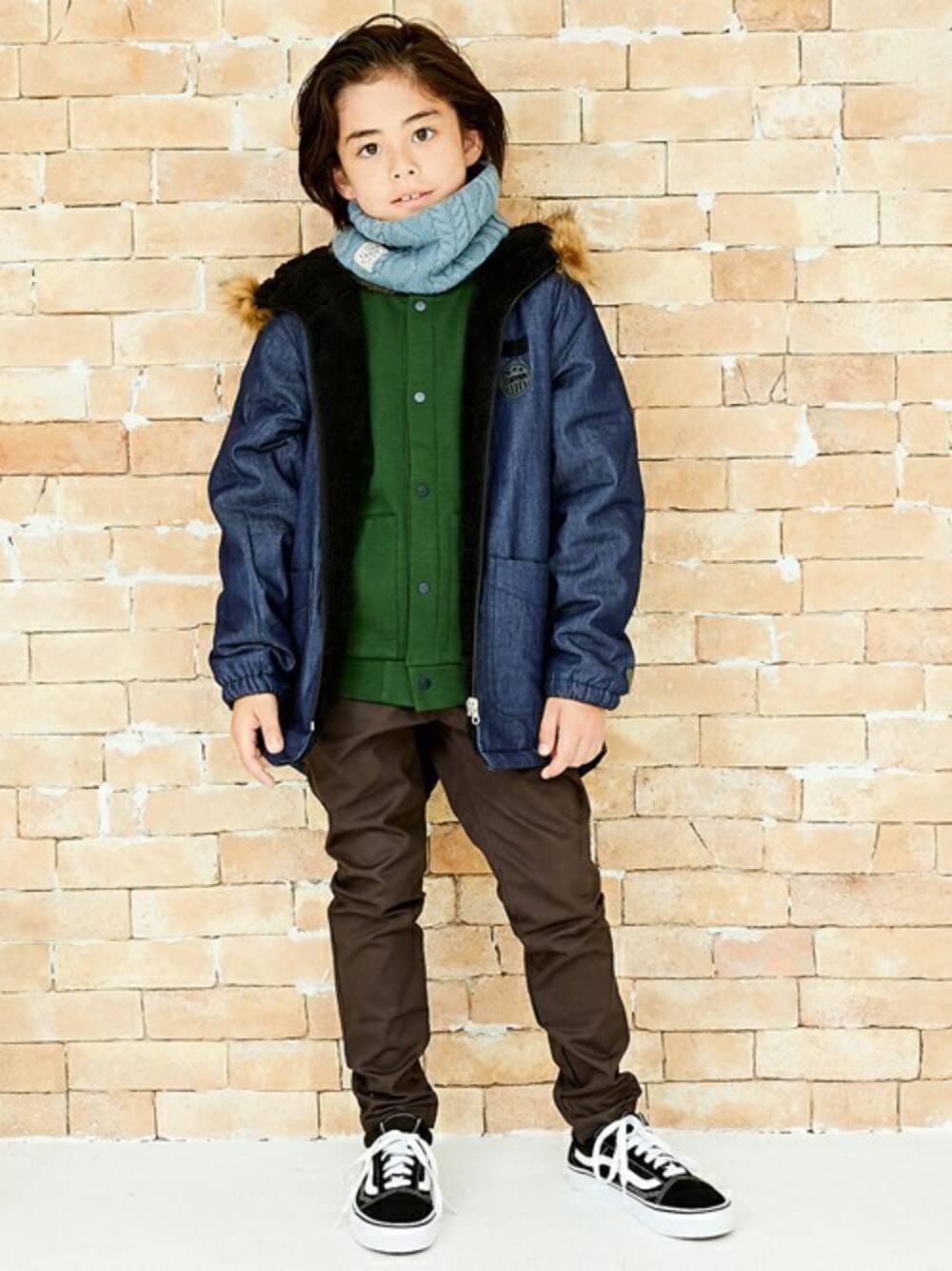 ブルーとグリーンで爽やかな印象♪ 首元のネックウォーマーは冬に大活躍! スタイリッシュで、暖かさも抜群コーデです。