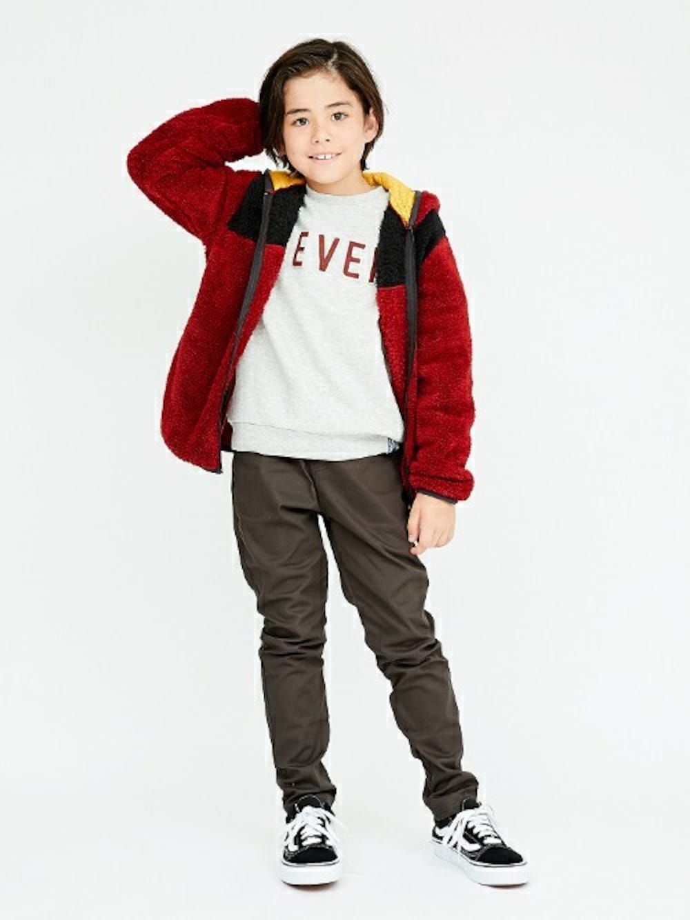 もこもこのパーカーは伸縮性と着心地抜群! バイカラーとフード裏のメッシュ素材でアウトドアテイストに◎ チャコールのパンツでかっこよく、スタイリッシュにまとめてみました♪