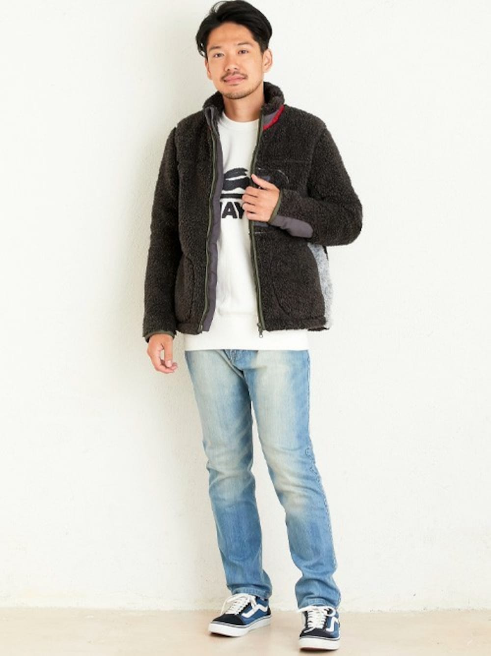 今季の人気アウター『シャギーボアフリースジャケット』を使ったコーデです。 インナーにはサガラ刺繍がポイントになったクルースウェット、ボトムスは人気定番アイテムのデニムクライミングパンツです!