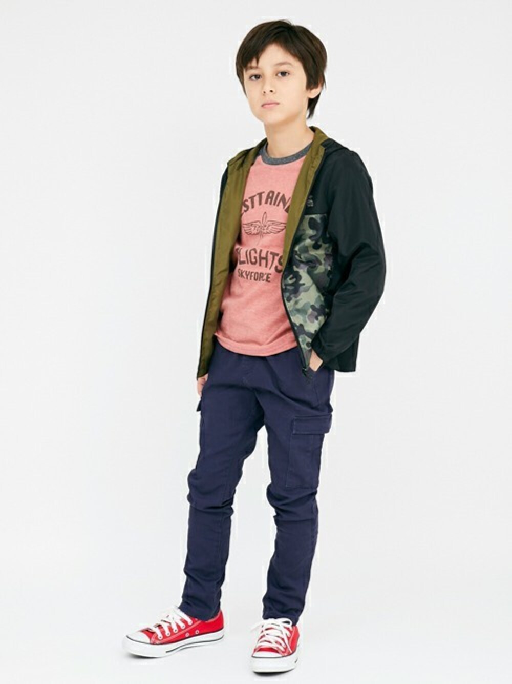 だんだん暖かくなるこれからの時期、さらっと羽織れるアウターがあると便利ですよね◎ 迷彩柄と無地の2パターン。気分に合わせてスタイルを変えられる、リバーシブルジャケットです! 足元はスッキリシルエットのパンツでまとめました♪